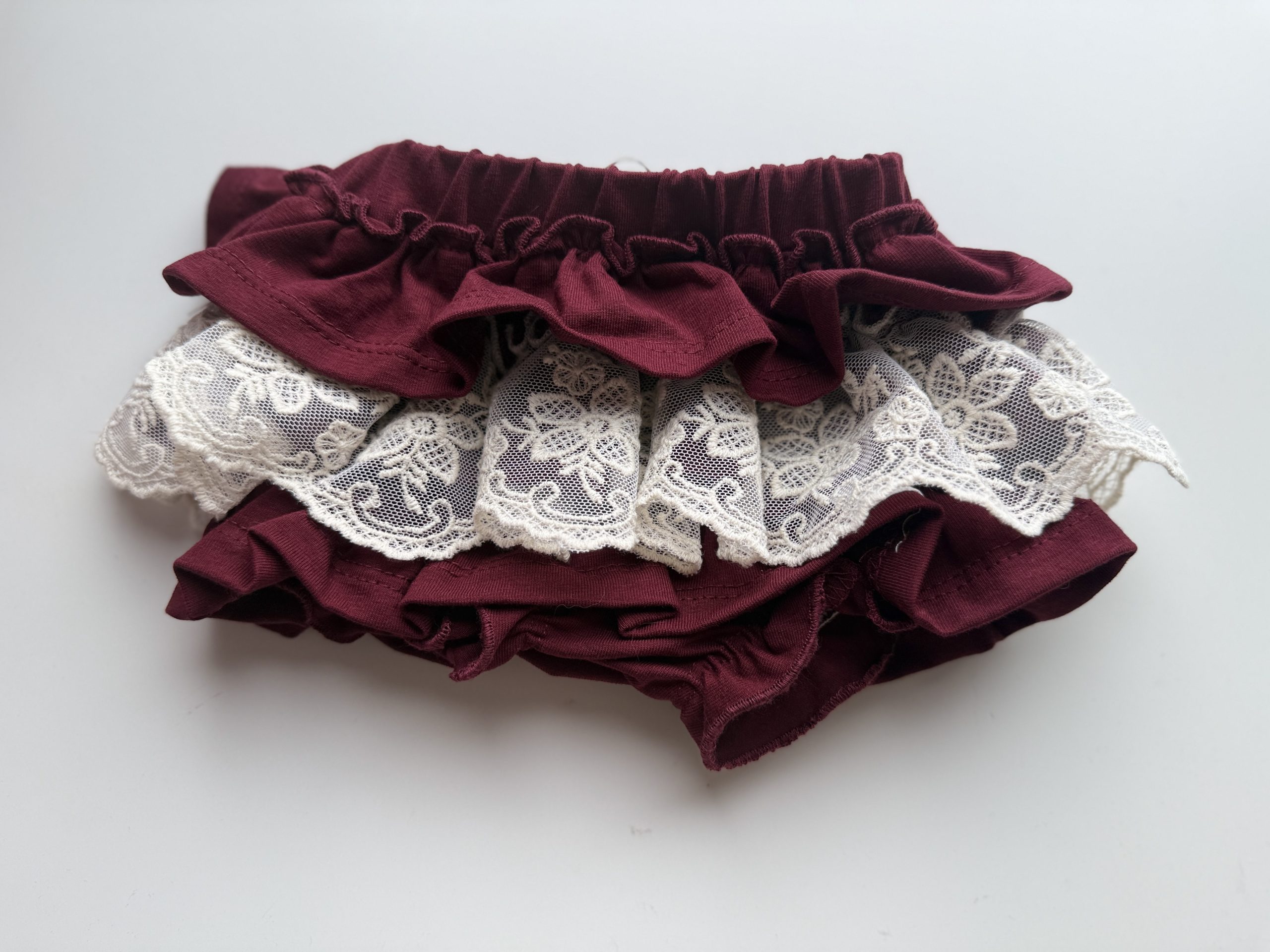 Bloomers (spódniczka z wszytymi pod spodem majtusiami) w kolorze zielonym ozdobiony koronką na falbankach.